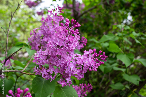 Close up view of beautiful fresh Persian lilac flower blossoms in full bloom, with defocused background