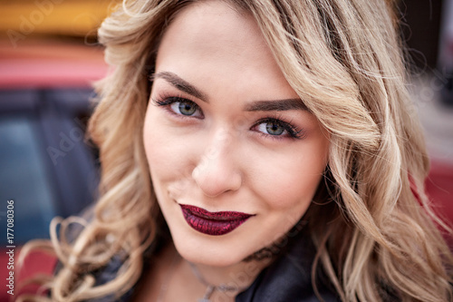 Close up view of beautiful woman lips with purple matt lipstick. Open mouth with white teeth. Cosmetology, drugstore or fashion makeup concept. Beauty studio shot. Passionate kiss