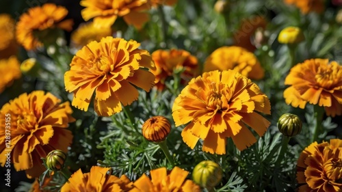 Close Up View of Beautifully Blooming Orange Marigolds with Green Foliage and Soft Daylight in a Natural Outdoor Setting