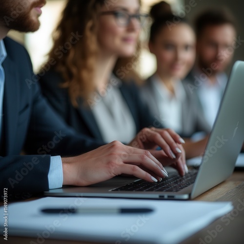 Close Up View Of Business People Typing On Computer Laptop While Working With Her Team