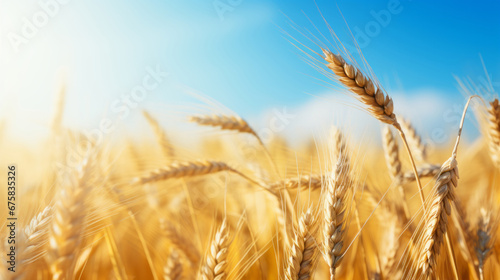 close, up, view, gold, wheat, field, blue, sky, agriculture, crop, cereal, farming, summer, grain, rural, landscape, harvest, mature, crop, bread, production, sunny, day, ripe, farmland, countryside, agricultural, scene, food, environment, stalk, industry, background, weather, cultivation, clear, agrarian, spike, organic, natural, against, bunch, object, row
