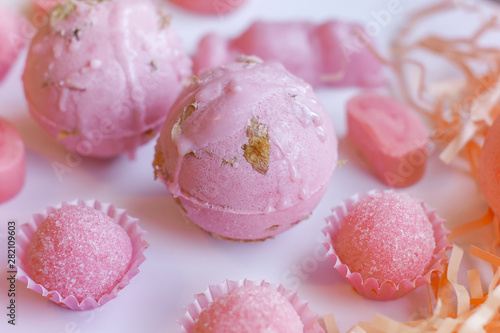 Close up view of handmade bath bomb, bubble bars and body scrub