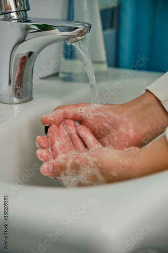 Close up woman washes her hands to prevent virus and germs. Covid
