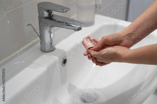 close up woman washing hands with soap and water, white foam, in the bathroom, under tap in the sink, personal hygiene and care, coronavirus prevention