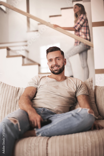 people, family, modern, interior, relationship, mood, stair, home, husband, sofa, sitting, wife, living, together, room, man, beautiful, portrait, lifestyle, young, boyfriend, male, female, relax, indoor, casual attire, house, looking, white, woman, television, human relationships, rest, communication, estate, recreation, apartment, comfort, father, holding, floor, to sit, smart, cosy, dream, romance, cosiness, watching