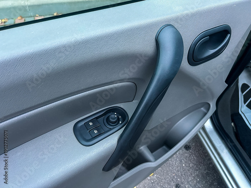 Close view of a car door interior showing the window switch and door handle with part of the car visible in the background