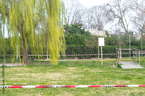 Closed public places during quarantine and pandemic, red and white tape restricts the passage