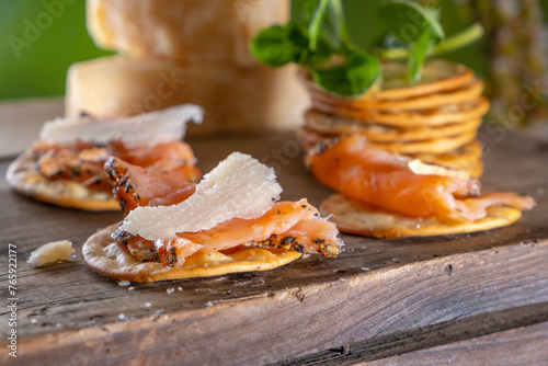 Close-Up 4K Ultra HD Image of Crackers with Smoked Salmon and Cheese - Stock Photography