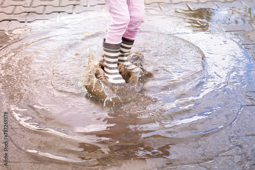 closeup 5-year-old girl joyfully jumps in rain puddle wearing rubber boots, children's feet in splashes water, happily jumping, pleasures of childhood