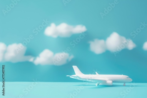Close-Up Airplane Model with Clouds on Blue Background - Transportation and Vacation Concept, Copy Space Available