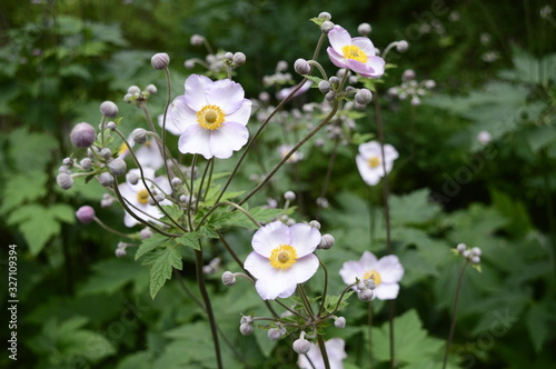Closeup Anemone hupehensis known as Japanese anemone with blurred background in garden