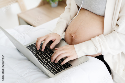 Closeup at hands of Asian pregnant mother looking for music on Laptop will help to feel relax, happy and have a positive effect on unborn child. Online shop related to children accessories on social.