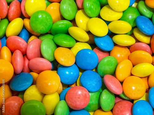Close-up background of colorful candy coated chocolates filling the frame. Bright sweets texture with vibrant colors, perfect for confectionery design, party themes, candy shop visuals, and playful fo