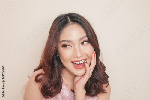 Close-up beauty face of Asian young model touching clean skin. Natural nude make-up. Skincare beauty facial treatment, spa, female health concept.