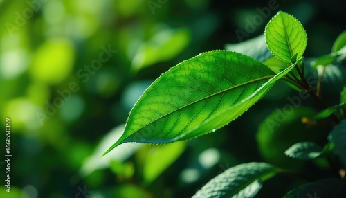 Closeup captures a vibrant green leaf bathed in soft sunlight, highlighting its delicate veins and natural textures