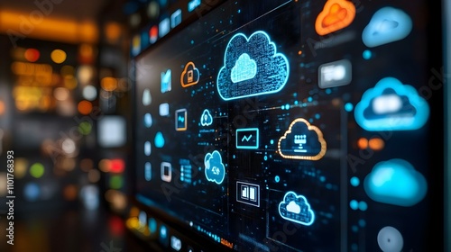 Close-Up Cloud Service Icons on Smart Device Digital Art Background for Digital Marketing Stock Photo