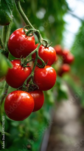 Close-up cluster of ripe tomatoes on vine for tomato harvest, glossy skins, shallow depth of field, garden path background