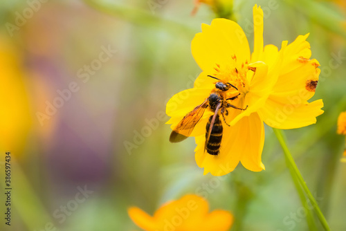 closeup cosmos flower with bee swarm in garden. Yellow, Orange cosmos flower.