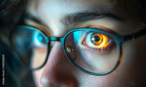 Close-up eye, glasses, illuminated pupil, skin texture.