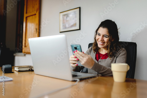 Close-up frontal portrait young smiling attractive woman working at office desk with computer laptop using smartphone.