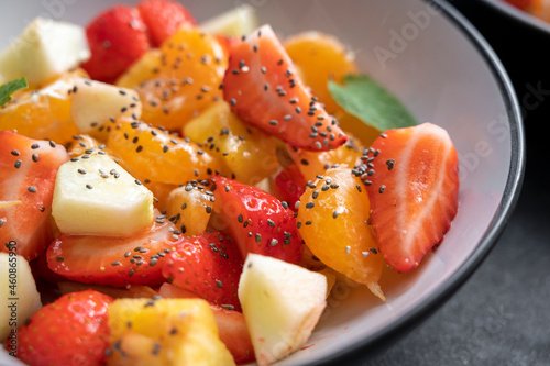 Closeup fruit salad for breakfast, mix of with fresh apple, strawberry, tangerines, pineapple and honey. Black background
