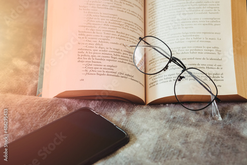 Close-up. Glasses resting on the open book, next to the cushion, mobile phone on the bed in the bedroom, in the morning.