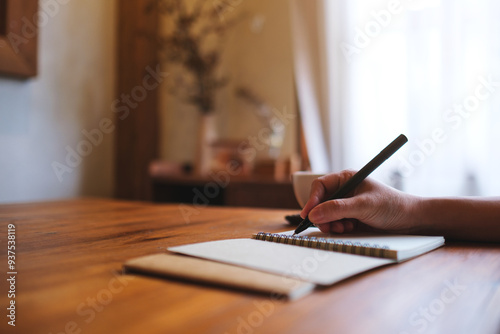 Closeup image of a hand writing on a notebook on the table