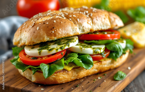 Close-up image of a vegetarian sandwich with tomato, egg, vegetable, and cheese