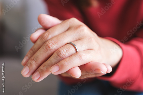 Closeup image of a woman wearing silver ring on her finger