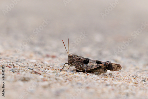 Close-up insect of Oedipoda caerulescens. Blue-winged grasshopper, Oedipoda caerulescens