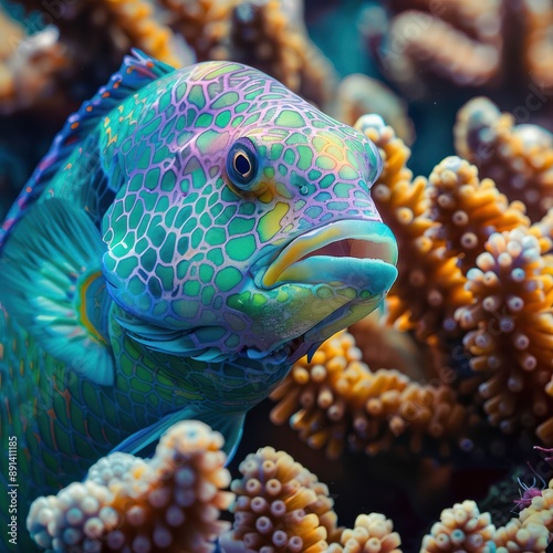 Close-Up Macro Shot of a Parrotfish Amidst Coral, for Nature Photography Backgrounds, Marine Environment Studies, Wildlife Documentation, Aquatic Biology, and Desktop Wallpapers