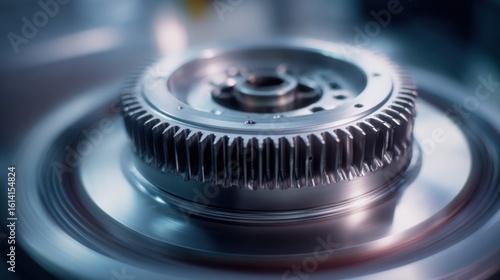 Closeup medium shot showcasing the compact design of a 48volt mildhybrid beltstarter generator assembly on a rotating platform with detailed focus on its gear mechanism and blurred