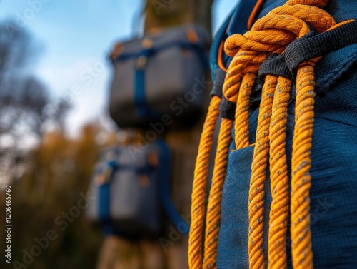 Close-up of Orange Climbing Rope on a Blue Jacket, with Blurred Background of Trees and Backpacks