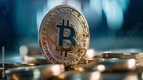 Closeup of a Bitcoin surrounded by gleaming coins signifying the rise of cryptocurrency in modern finance : Generative AI