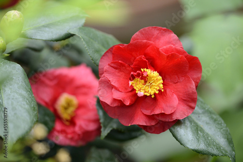 outdoors, daytime, plant, colours, structure, closeup, detail, image, front, stamen, bush, flora, european, bloom, evergreen, frontal, part, picture, german, photograph, cropped, german, full bloom, red flower, selective focus, nature, exterior, close, orange, nobody, red, natural, color image, flower head, orange color, camelia, color photography, xanthous