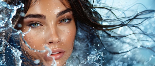 Close-up of a brunette woman with wet hair, blue eyes, and glowing skin, surrounded by water droplets. Free copy space for text.