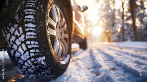 Close-up of a car tire driving on a snowy road at sunrise. The winter scene highlights the importance of safe driving conditions and the beauty of a snow-covered landscape.