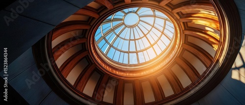 circular, skylight, building, glasses, pattern, creating, beautiful, intricate, design, light, sun, shining, glow, wall, ceiling, painted, dark, blue, colours, wood, effect, elegance, photo