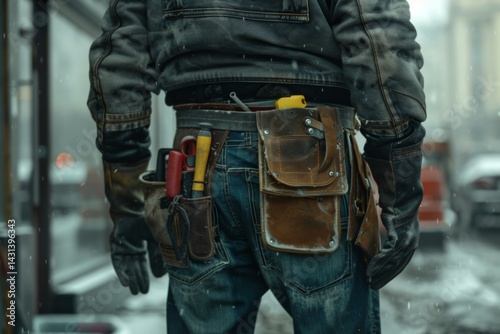 Close-up of a construction worker with a bag and tools kit worn on the waist