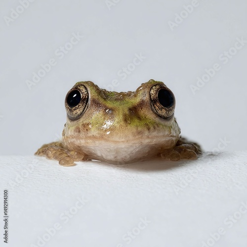 Close-up of a curious green frog peering over a white surface, highlighting its unique eyes and skin texture