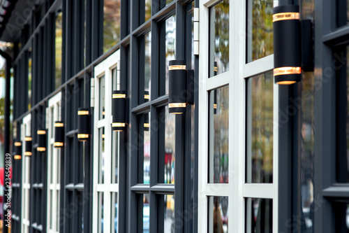 closeup, nobody, facades, window, glasses, lantern, lighting, modern, new, black, iron, white, view, side, perspective, metal, office, business, window, building, architecture, wall, background, house, exterior, design, decorative, urban, structure, apartment, front, pattern, decoration, texture, style, detail, city, construction, town, contemporary, lamp, close, architectural
