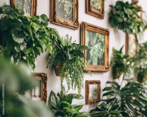 Close-up of a decorative wall featuring lush greenery arranged in ornate frames within a contemporary interior.