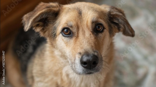 Close-up of a dog's face. the dog appears to be a mixed breed, possibly a german shepherd or a similar breed. it has a light brown coat with darker brown patches on its face and chest.