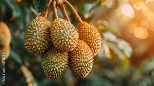 Close-up of a durian tree, with fruits ready to be harvested for export