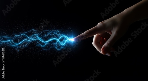 Close-up of a finger touching an electric spark, generating intricate neural patterns on a dark background, symbolizing artificial intelligence, machine learning,