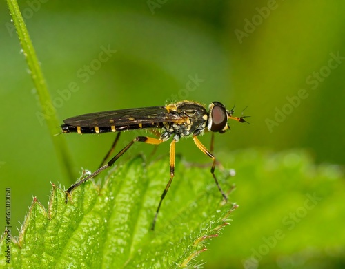 fly, insect, leaf, nature, macro, detail, green, black, yellow, orange, close, sharpened, wing, body, antennae, eye, natural, wildlife, environment, bright, fresh, plant, small, beautiful, life, texture, pattern, perspective, closeup