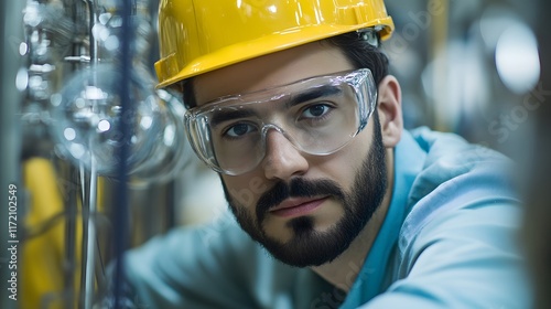 Close-up of a focused male engineer wearing safety glasses and a yellow hard hat, working amidst industrial machinery. Serious expression, conveying expertise and precision.