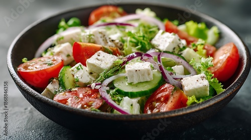 Close-up of a fresh salad in a dark bowl with tomatoes, cucumbers, onion, and cheese