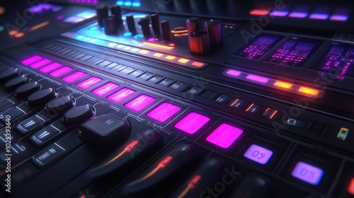 console, music, production, futuristic, buttons, glowing, control, digital, interface, technology, electronic, synth, studio, mixer, sound, audio, beat, rythm, track, dj, instrument, knob, fader, slider, light, neon, purple, pink, orange, red, black, dark, detail, abstract, design, modern, glossy, metallic, panel, display, screen, keyboard, key, pad, groove, sampler, workflow