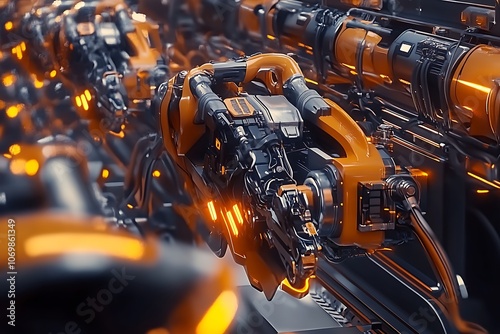 robotic, arm, orange, black, metal, futuristic, technology, machinery, industrial, automation, gear, cable, pipe, engine, mechanism, steel, detail, abstract, science, fiction, design, concept, three-dimensional, render, illustration, background, texture, pattern, shiny, glossy, bright, dark, shadow, light, glow, line, shape, curve, angle, surface, contrast, sharpened, blur, depth, perspective, composition, artwork, art